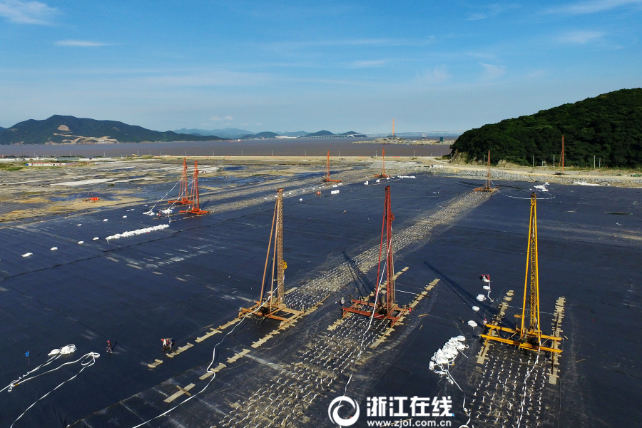 浙江在线7月18日讯(浙江在线拍友 姚峰 摄)7月17日下午,舟山市定海区金塘岛北部区块建设工地,工人们在烈日下抓紧施工,无论是道路、河道建设项目,还是地基深层处理工地,各项建设都在有序推进中。